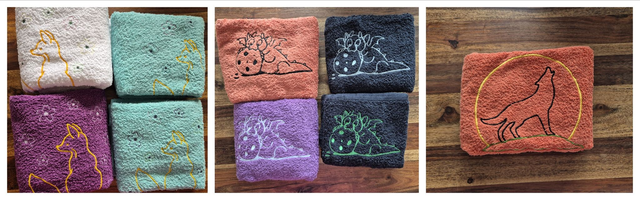 Die Stickdatei Watercolor-Fox stammt von DigitalByOlga. Die Stickdatei "Dragon Cookie" stammt von Rev.